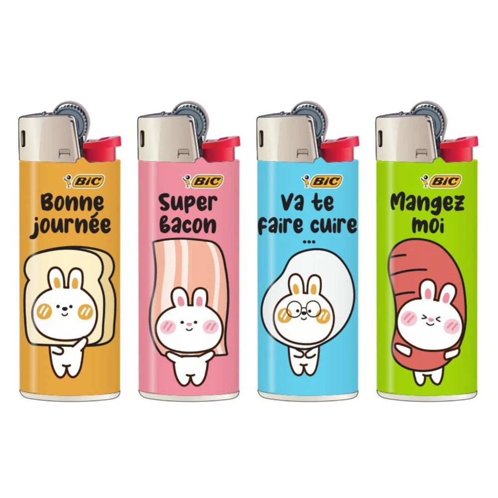 Barquette de 50 briquets BIC J25 Mini avec des illustrations sur le thème de la bonne humeur matinale. Briquets à pierre et à gaz, 8 modèles différents