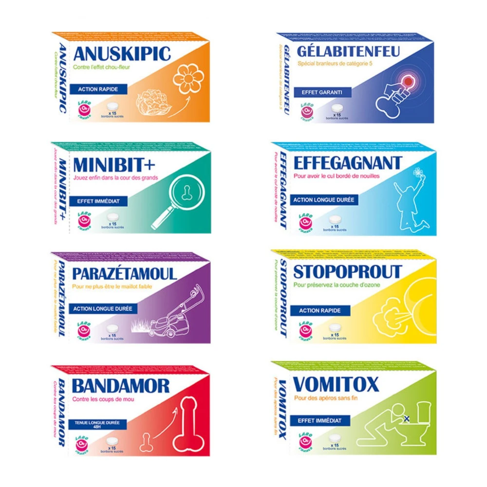 Des boîtes de bonbons à la menthe avec des packagings de médicaments, retrouvez l’Effegagnant, le Stopoprout, le Gélabitenfeu, le Bandamor, le Minibit+, le Vomitox, l’Anuskipic et enfin le Parazétamoul