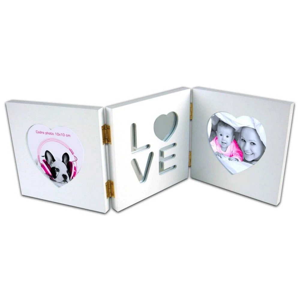 Cadre photo en bois a disposé comme bon vous semble. Dimensions 14 x 42.5 cm. Deux emplacements en forme de coeur pour deux photos 10 x 10 cm. Le volet centrale est découpé pour laisser apparaitre un miroir avec l’inscription LOVE
