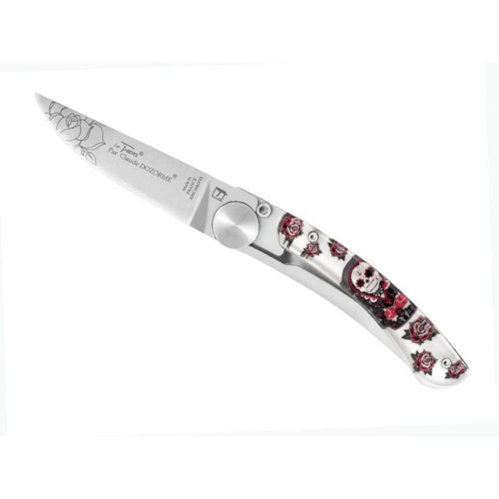 Ce couteau de marque LE THIERS par C. DOZORME par C. DOZORME, lame acier X50CrMoV15 à cran intérieur (en position fermée la lame entièrement plate du côté du manche reste apparente), manche 10,5 cm habillage inclusion résine avec décor, avec clip ceinture/porte billets.