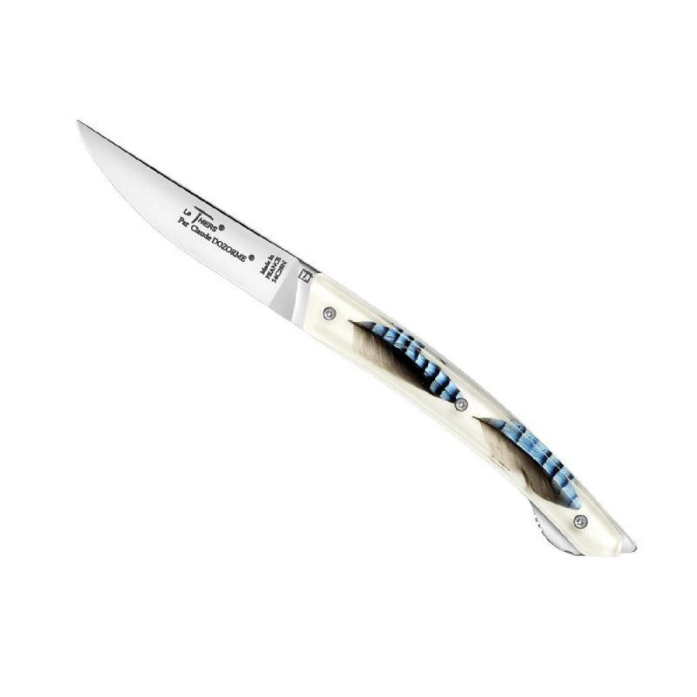 Ce couteau de marque LE THIERS par C. DOZORME, lame acier X50CrMoV15 brillante (le blocage s’effectue grâce à un loquet de verrouillage situé en bout de manche), plein manche 12 cm avec inclusion de plumes de geai, en coffret.