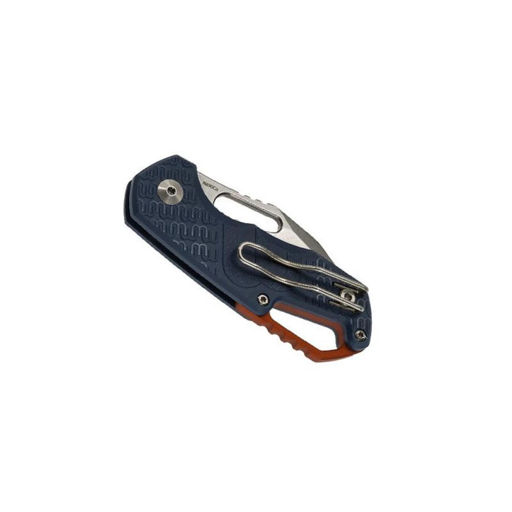 Couteau pliant de la marque MKM « ISONZO » par FOX KNIVES, lame Clip point à trou acier N690Co finition « stonewashed » avec mécanisme « Ball bearing » et cran intérieur, manche 9 cm FRN bleu, pivot et entretoise aluminium anodisé orange, avec clip.