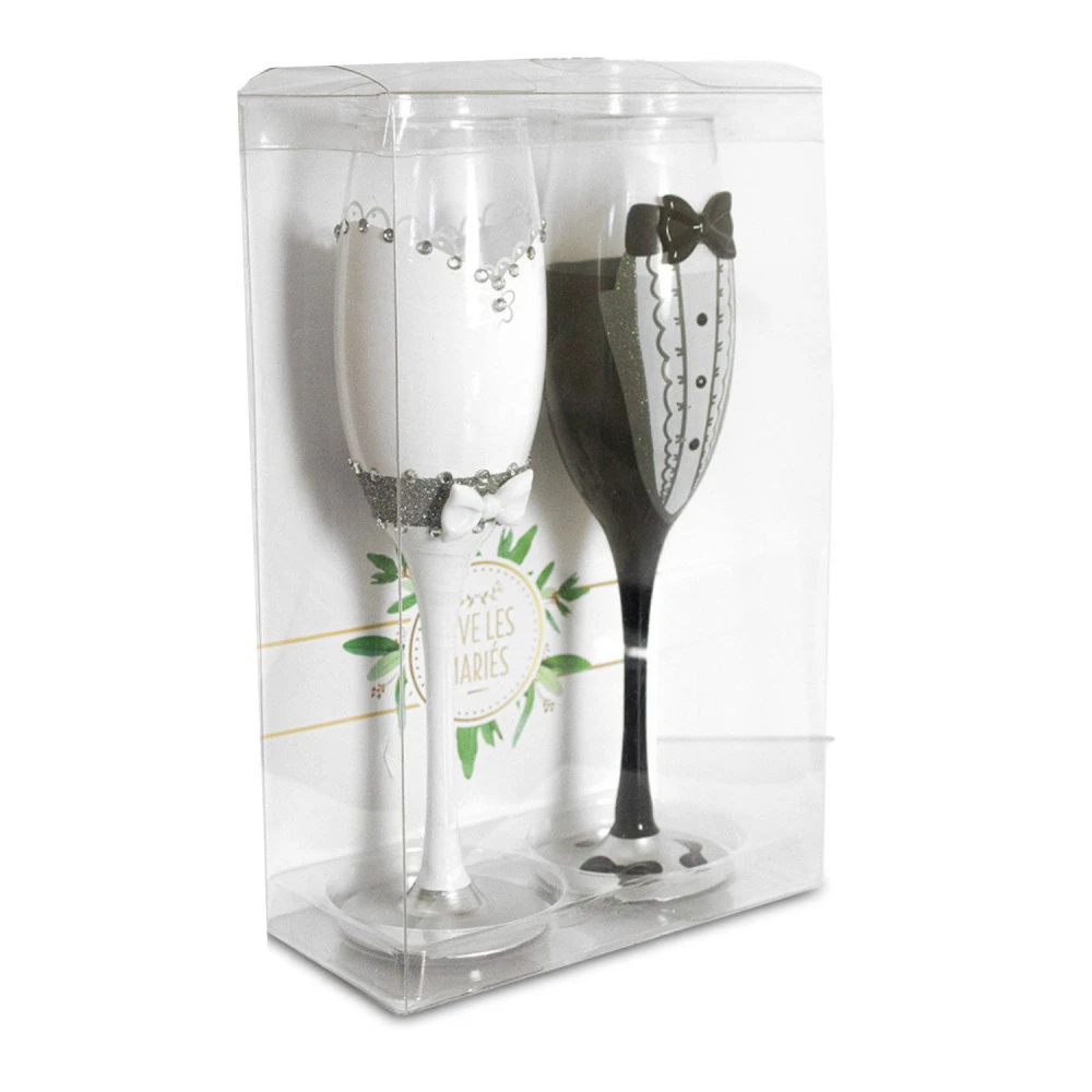 Coffret cadeau pour jeunes mariés comportant deux flûtes à champagne, une blanche habillée d’une robe et une noire d’un costume de marié.Hauteur 25cm environ.