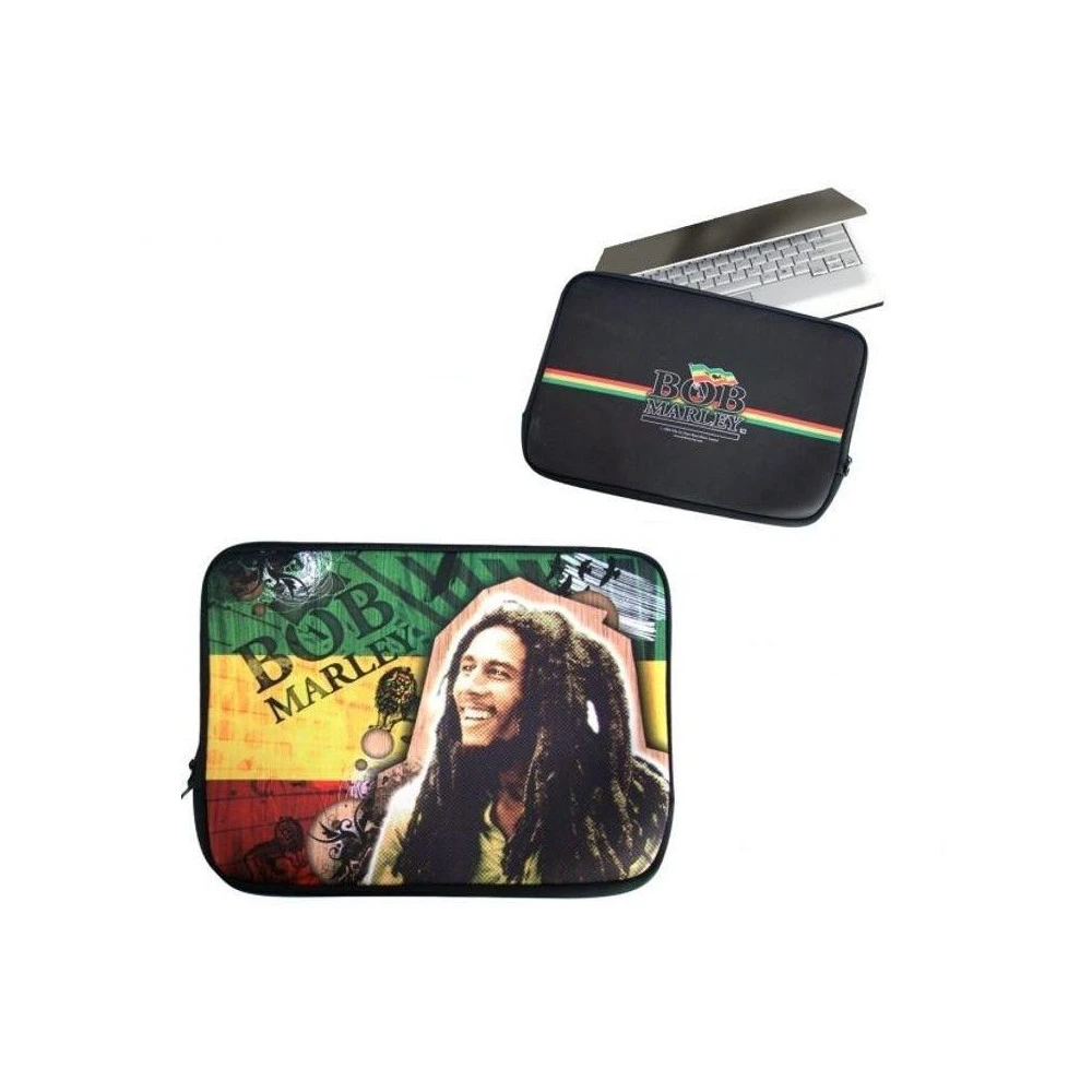 Housse de portable zippée à l’effigie de Bob Marley. Dimensions 29 x 39 cm pour ordinateur portable jusqu’à 15 pouces