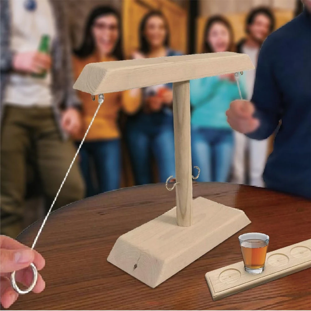 on place le shooter au centre de la planche quant aux joueurs ils se placent de chaque cotés de la potence chacun à sa cordelette avec un anneau, le but est d’accrocher l’anneau à son crochet en le lançant pour marquer un point, ce point servira à rapprocher le shooter de son adversaire, le premier qui déplace le shooter à l’extrémité adverse lui fait boire le contenu.