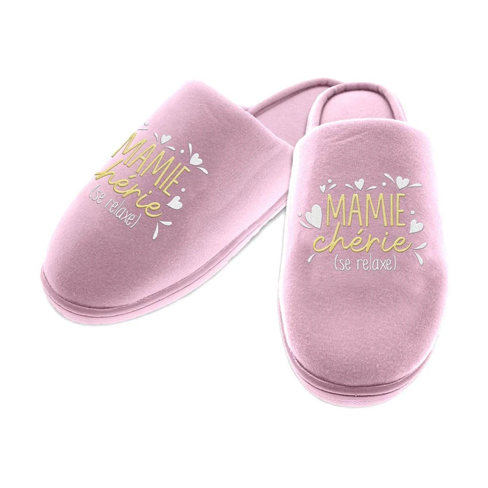 Pantoufles Mamie Chérie, un cadeau original et plein d’Amour ! Chaussons roses avec inscription « Mamie Chérie (se relaxe) ». Semelle confortable, intérieur 100% coton. Taille 36 – 38