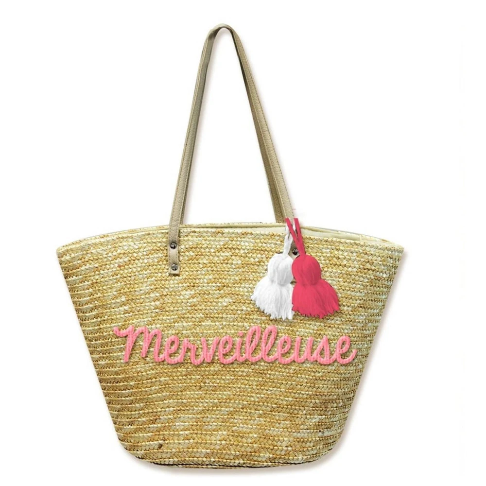 Ce panier fait de paille et de polyester possède une doublure et deux anses avec sur le côté l’inscription « Merveilleuse ! » accompagné de deux pompons blanc et orange. Un sac idéal pour le quotidien avec sa poche intérieur et sa fermeture éclair.