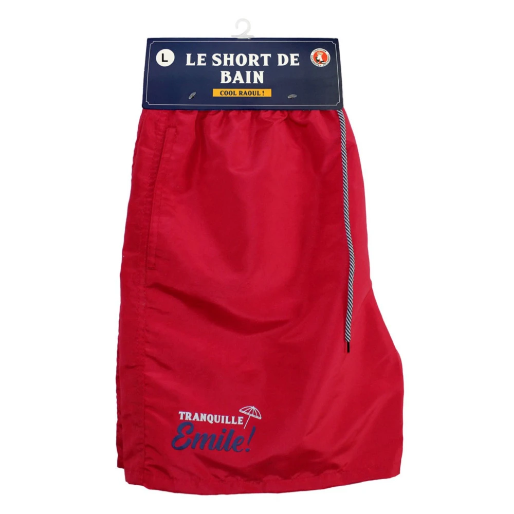 Ce short de bain taille L « Tranquille Emile » est un accessoire idéal pour passer l’été en toute légèreté ! Son coloris rouge et son imprimé blanc et bleu marine « Tranquille Emile ! » avec un petit parasol saura instaurer un climat de détente lors d’après midi à la piscine ou à la plage.