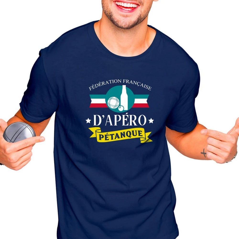 T-Shirt pour homme sur le thème de la pétanque parfait pour offrir, coloris bleu avec l’inscription « Fédération Francaise d’apéro pétanque ». Avec un col rond, ce t-shirt 100% coton possède un grammage de 160 gr/m², taille L. Le cadeau idéal pour tout fan de pétanque !