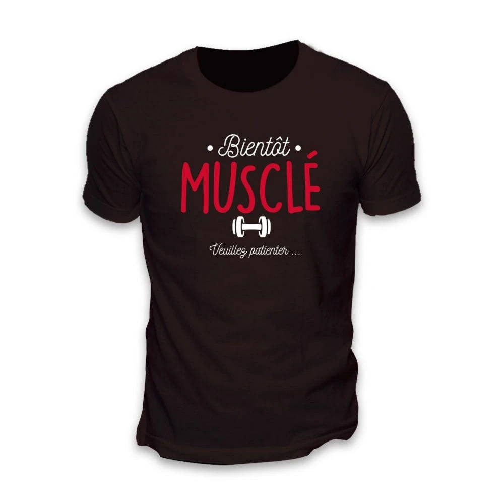 T-Shirt pour homme à offrir, coloris noir avec la phrase humoristique « Bientôt musclé, veuillez patienter ». Avec un col rond, ce t-shirt 100% coton possède un grammage de 160 gr/m², taille M. Le cadeau idéal pour offir à son partenaire !