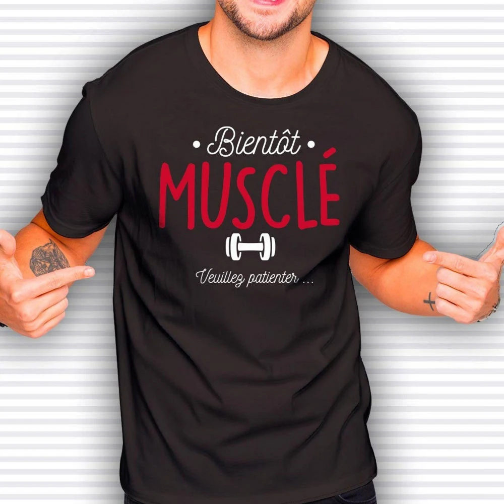 T-Shirt pour homme à offrir, coloris noir avec la phrase humoristique « Bientôt musclé, veuillez patienter ». Avec un col rond, ce t-shirt 100% coton possède un grammage de 160 gr/m², taille XL. Le cadeau idéal pour offir à son partenaire !
