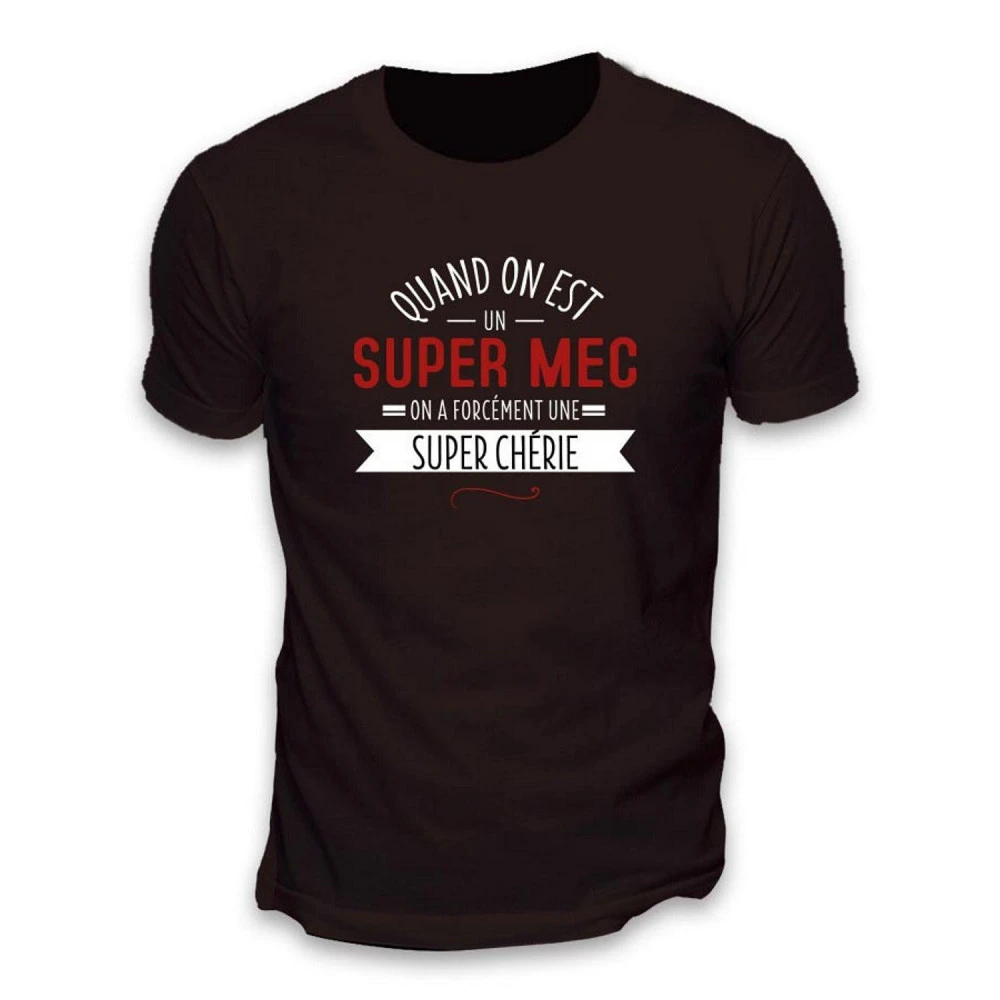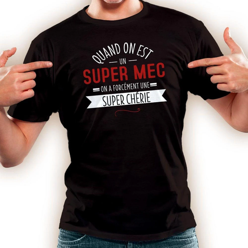 T-Shirt pour homme à offrir, coloris noir avec la phrase humoristique « Quand on est un super mec on a forcément une super chérie ». Avec un col rond, ce t-shirt 100% coton possède un grammage de 160 gr/m², taille L. Le cadeau idéal pour faire plaisir à son partenaire !