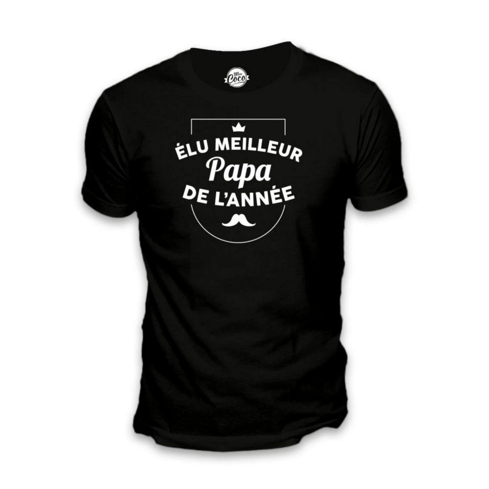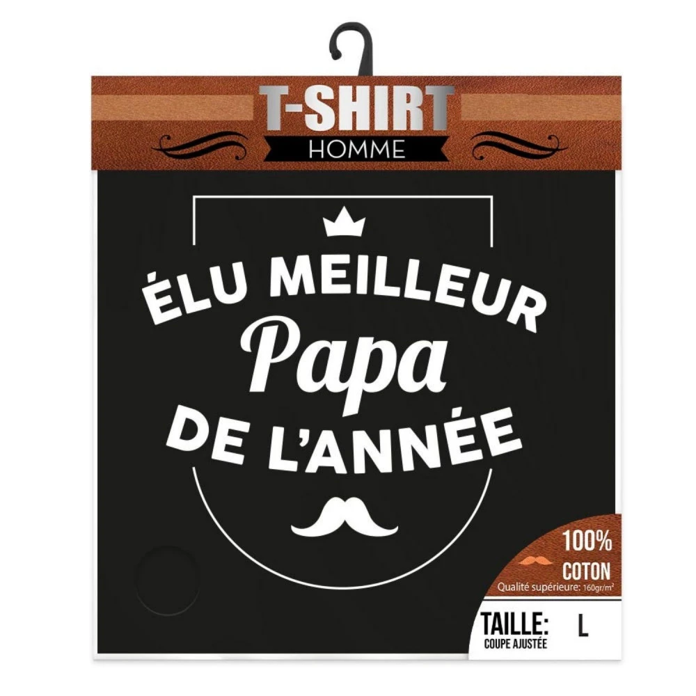 T-Shirt pour Homme à offrir, coloris noir avec l’inscription « Élu Meilleur Papa de l’Année ». Avec un col rond, ce t-shirt 100% coton possède un grammage de 160 gr/m², taille L. Le cadeau idéal pour un Anniversaire ou pour la Fête des Pères