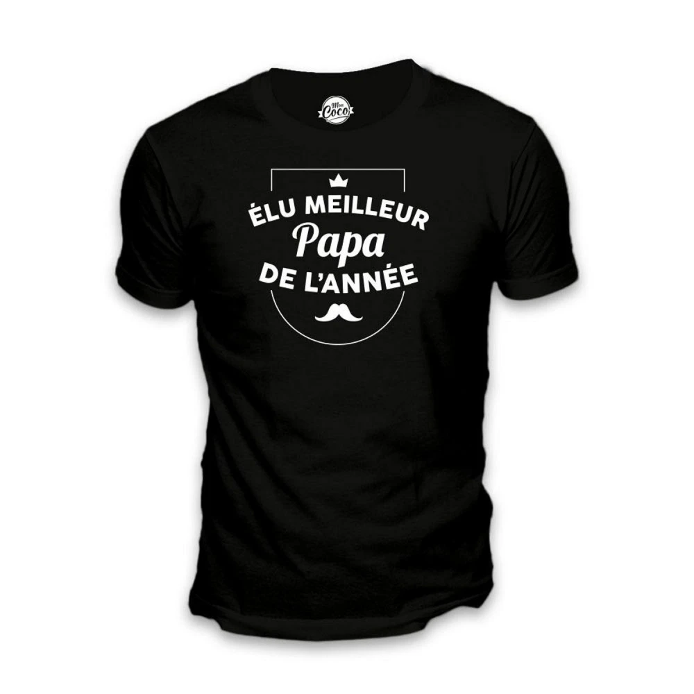 T-Shirt pour Homme à offrir, coloris noir avec l’inscription « Élu Meilleur Papa de l’Année ». Avec un col rond, ce t-shirt 100% coton possède un grammage de 160 gr/m², taille XL. Le cadeau idéal pour un Anniversaire ou pour la Fête des Pères