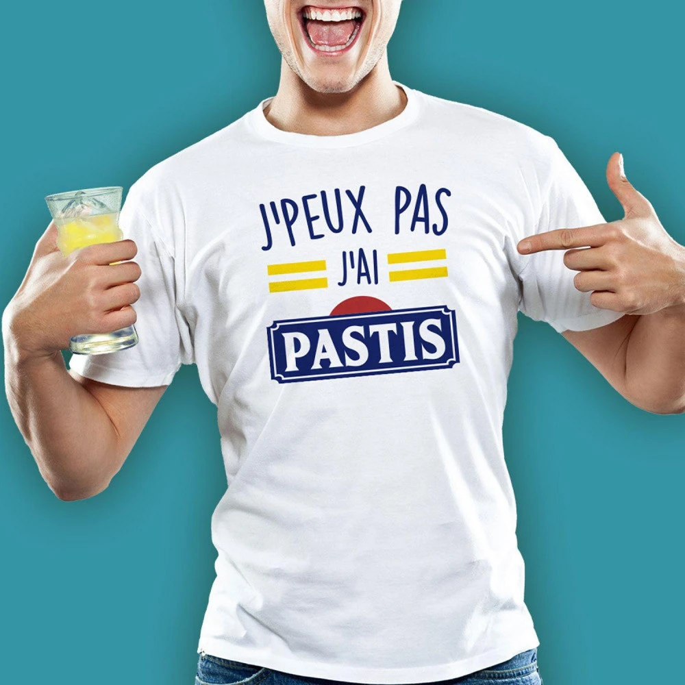 T-Shirt pour homme à offrir, coloris blanc avec la phrase humoristique « J’peux pas j’ai pastis ». Avec un col rond, ce t-shirt 100% coton possède un grammage de 160 gr/m², taille M. Le cadeau idéal pour faire plaisir à un proche