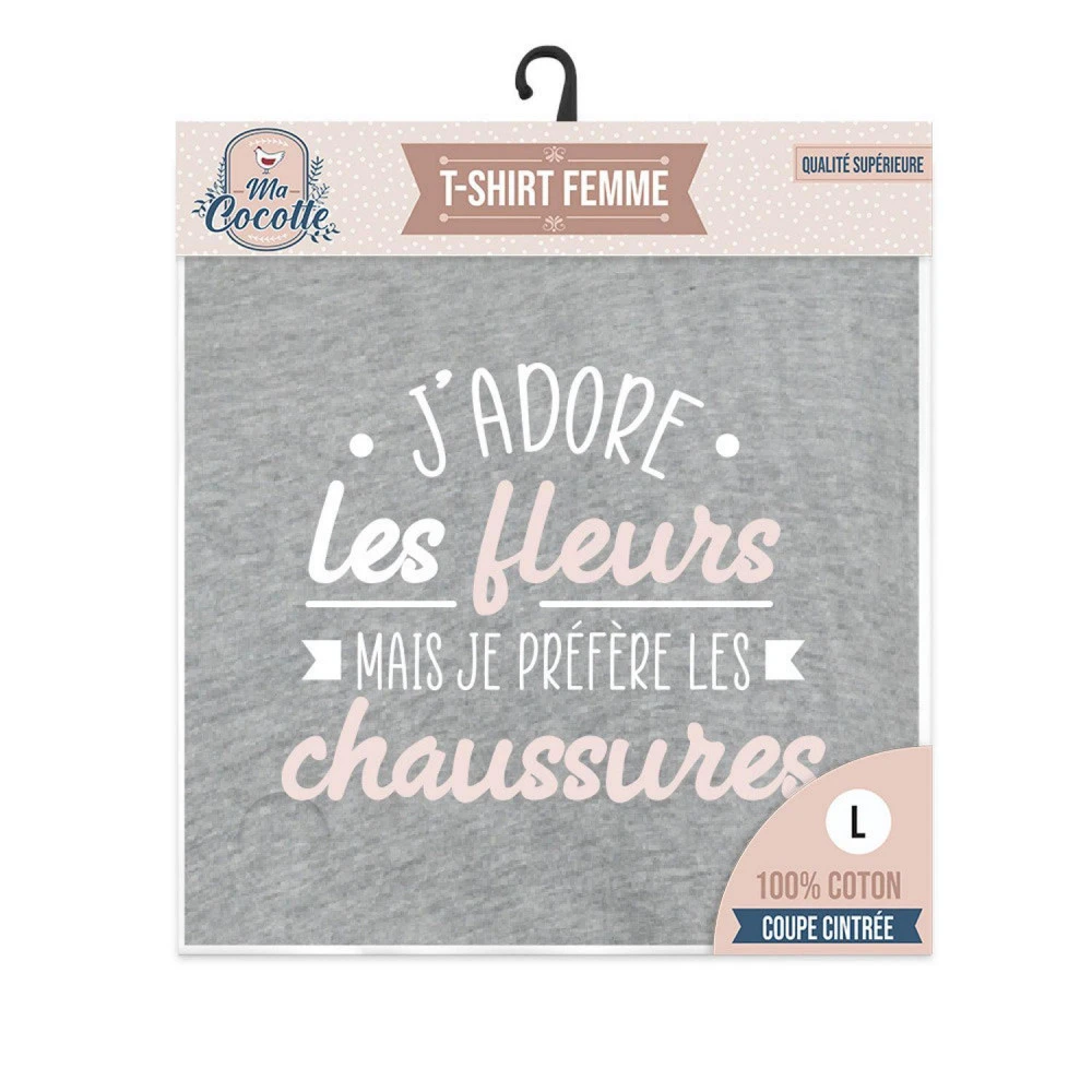 T-Shirt pour femme à offrir, coloris gris avec la phrase humoristique « J’adore les fleurs, mais je préfère les chaussures ». Avec un col rond, ce t-shirt 100% coton possède un grammage de 160 gr/m², taille L. Le cadeau idéal pour faire plaisir à sa partenaire !