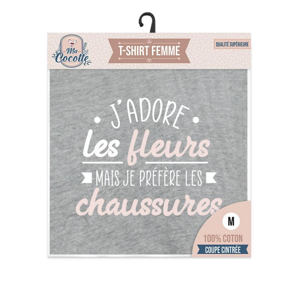 T-Shirt pour femme à offrir, coloris gris avec la phrase humoristique « J’adore les fleurs, mais je préfère les chaussures ». Avec un col rond, ce t-shirt 100% coton possède un grammage de 160 gr/m², taille M. Le cadeau idéal pour faire plaisir à sa partenaire !