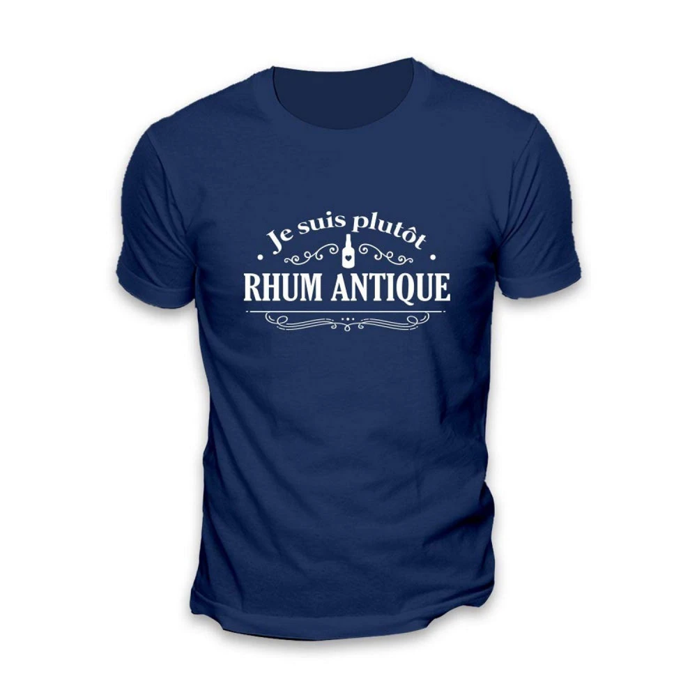 T-Shirt pour homme à offrir, coloris bleu avec la phrase humoristique « Je suis plutôt rhum antique ». Avec un col rond, ce t-shirt 100% coton possède un grammage de 160 gr/m², taille L. Le cadeau idéal pour offir à son partenaire !