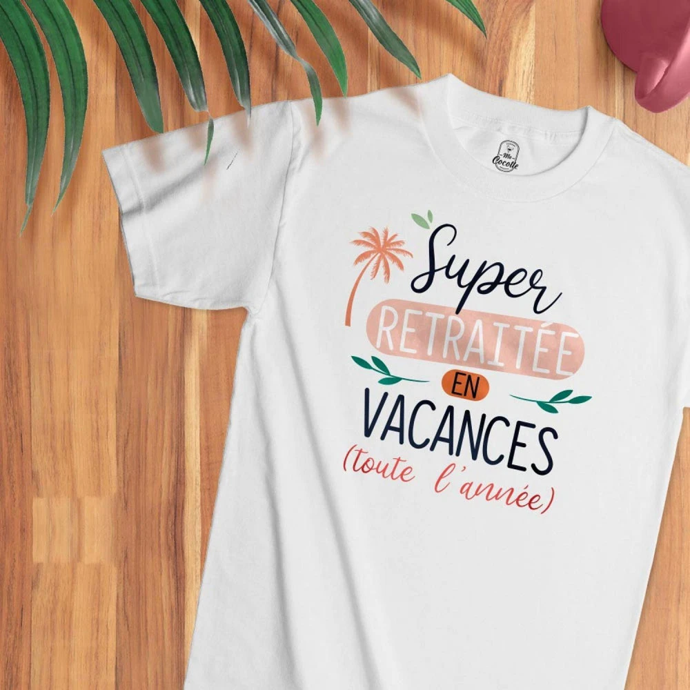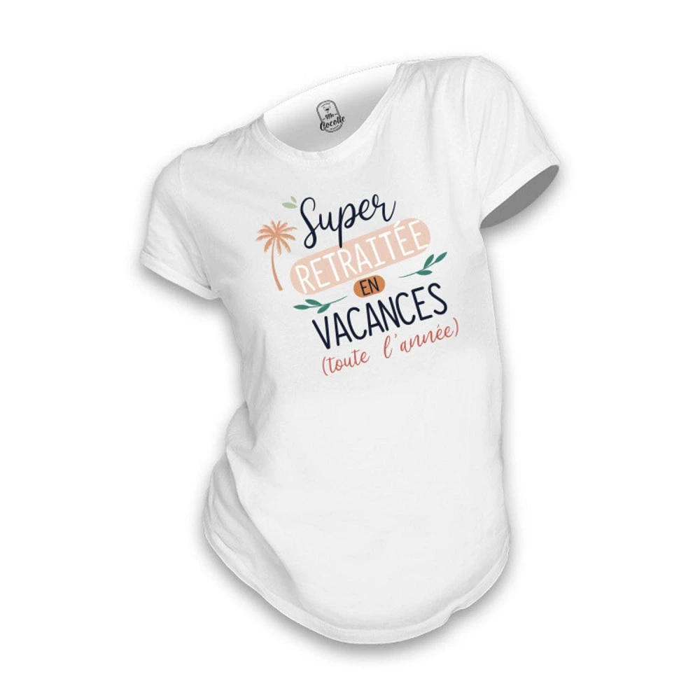 Un cadeau original pour un départ en retraite, ce superbe T-Shirt est illustré et possède l’inscription « Super Retraitée en vacance toute l’année ». Article en taille S, fabrication 100% coton avec un grammage de 160 g/m2, une coupe ajusté possédant un col rond