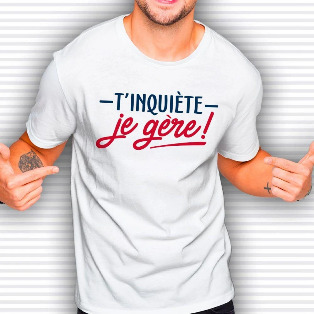 T-Shirt pour homme à offrir, coloris blanc avec la phrase humoristique « T’inquiète je gère ». Avec un col rond, ce t-shirt 100% coton possède un grammage de 160 gr/m², taille L. Le cadeau idéal pour offir à son partenaire !
