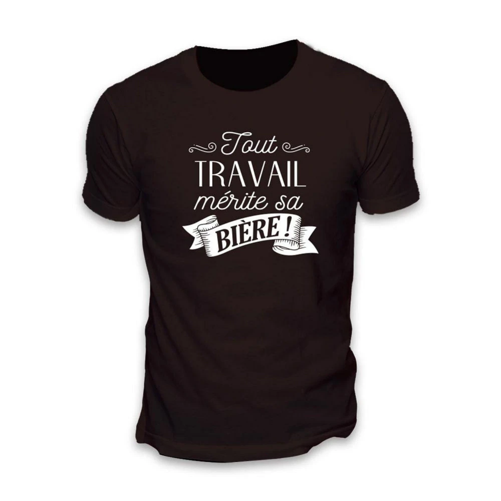 T-Shirt pour homme à offrir, coloris noir avec la phrase humoristique « Tout travail mérite sa bière ». Avec un col rond, ce t-shirt 100% coton possède un grammage de 160 gr/m², taille XL. Le cadeau idéal pour offir à son partenaire !