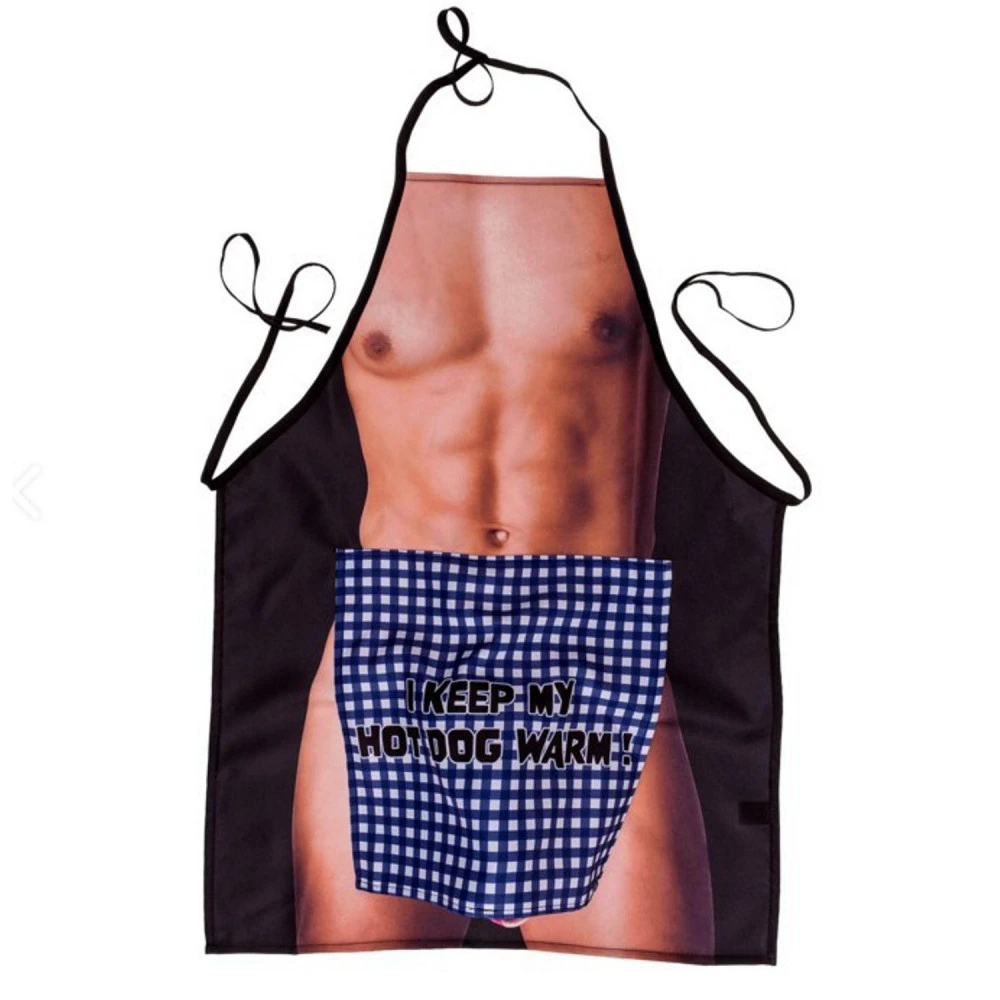Tablier de cuisine sexy avec une surprise… Sous la partie centrale se cache un faux zizi. Tablier avec imprimé corps d’homme et l’inscription « I keep my hotdog warm ! » (je garde mon hotdog au chaud). Cadeau humoristique idéal pour un anniversaire par exemple. En polyester, dimensions environ 49 x 69.5 cm, taille unique