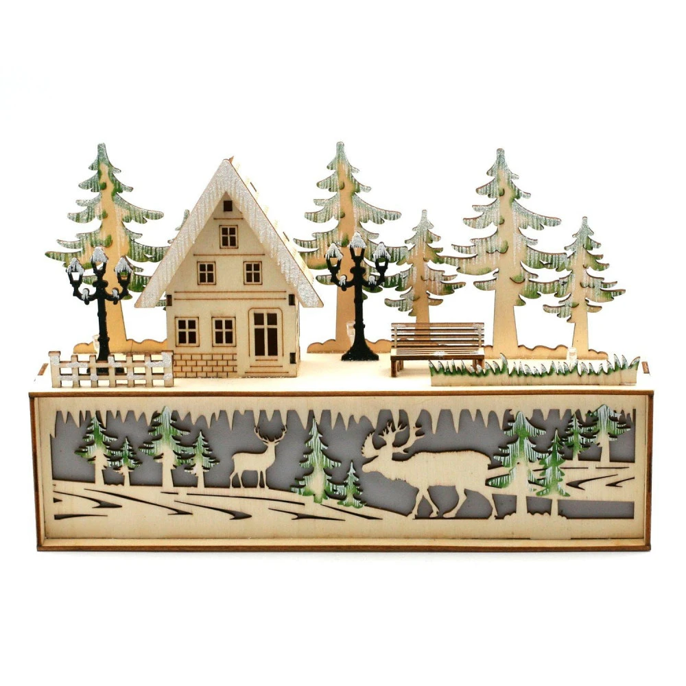 Pour une décoration de Noël réussie, voici ce superbe villahe lumineux en bois. Fonctionne à LED avec pile (non fournie), dimensions environ 20 x 30 cm
